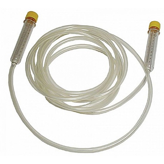 Водяной уровень представляет собой два цилиндрических прозрачных сосуда с нанесенной одинаковой шкалой, соединенных длинной эластичным тонким шлангом. По физическому закону сообщающихся сосудов уровень жидкости в них всегда находится на одной высоте от горизонта. Таким образом, сделав одну отметку на определенном уровне, можно с высокой точность перенести ее на другие поверхности в пределах длины гибкого шланга.